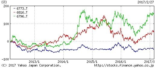 下図のチャートは2012年からの過去5年間の推移を示しています。パイオニアは2009年にPDPからの撤退などの大規模リストラを行っていますが、リストラにより経営危機は回避できたものの、高い採算性や成長力は取り戻していません。そのことを示唆するように、パイオニアの株価はこの5年間、ほぼ狭いボックス圏で推移しており、同業2社比べると大きくアンダーパフォームしていることが読み取れます。