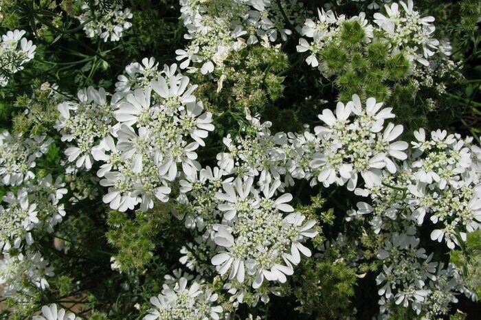 白いレースのような繊細でかわいい花が魅力的なオルレア。暑さに弱く、日本では一年草として扱っています。こぼれ種で毎年増え、そのままにしておくとどんどんスペースを占領するほど強健です。