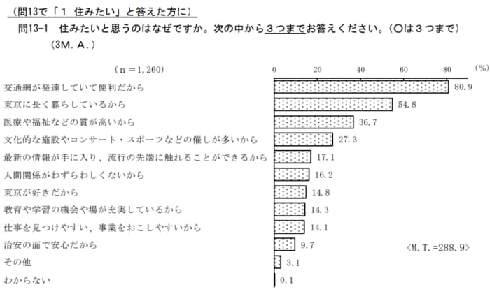 最も多いのは「交通網が発達していて便利だから」で80.9%。公共交通機関が発達している東京はどこへ行くにもアクセスが良く、地方とは違い車を保有しなくても生活できるのは一つのメリットでしょう。