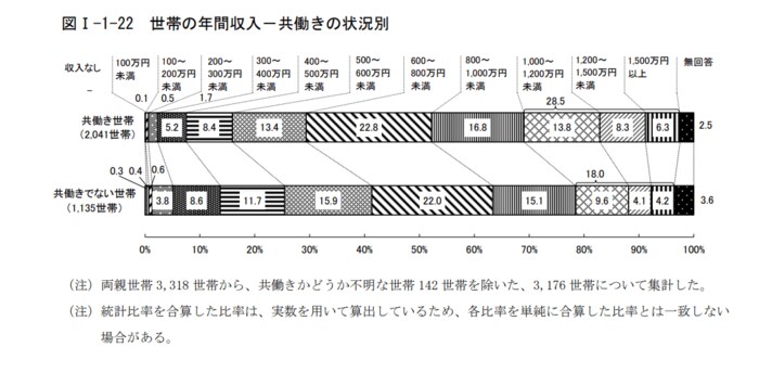 共働き世帯では「800~1000万円未満」(16.8%)、「1000~1200万円未満」(13.8%)、「500~600万円未満」(13.4%)と続きます。