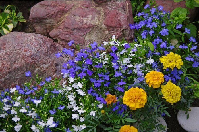 大きな岩は重くて大変なので、ホームセンターなどで軽い溶岩石や軽石を購入してもよいでしょう。石の間に土を入れ、苗を植え込むとロックガーデンの完成です。