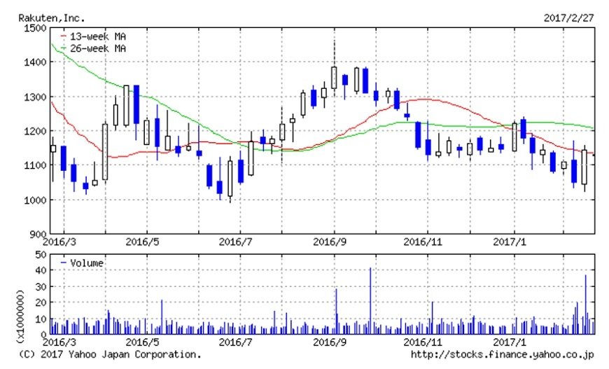 しかし、過去1年で見れば楽天の株価は1,000~1,400円付近でのボックス相場を上抜けるまでに至っていません。楽天の株価がボックス相場を抜けて今後上昇するための条件等を、業績面およびチャート面から考えてみました。