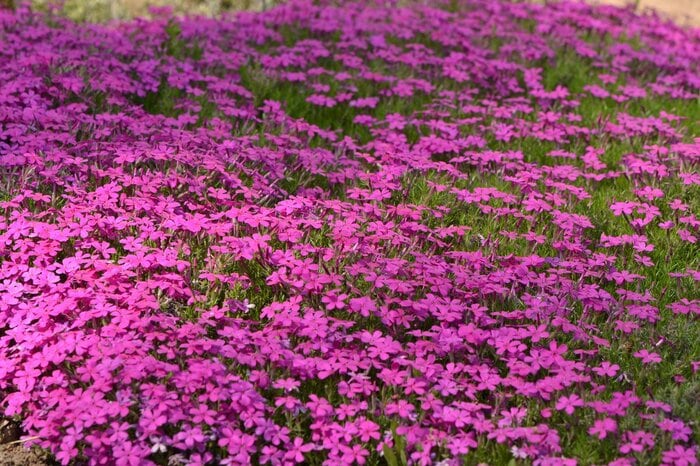 かわいらしいピンクの小花がサクラに似て、芝のように広がる多年草のシバザクラ。環境が合えば、一面を覆うように生育するのでグランドカバーに多用されています。
