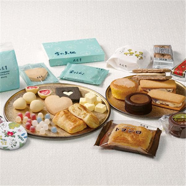 ・商品内容:トヨシロ2個(約3日)、べこ餅2個(4~5日)、マルセイバターサンド3個(9~10日)、ストロベリーチョコホワイト60g1袋(約30日)、万作2個(16~17日)、チョコマロン2個(9~10日)、雪やこんこ2枚(約20日)、霜だたみ2個(14~15日)、雪の大地1箱(約50日)、六花のつゆ1缶(約45日)、マルセイビスケットプレゼント2枚(約35日)