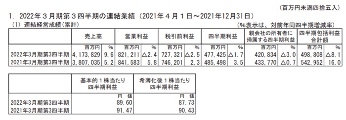 ソフトバンクが2022年2月3日に発表した2022年3月期第3四半期の決算短信では、売上高は4兆1738億円(前年同期比+9.6%)、営業利益は8212億円(同-2.4%)、親会社の所有者に帰属する四半期利益は4208億円(同-3.0%)となりました。