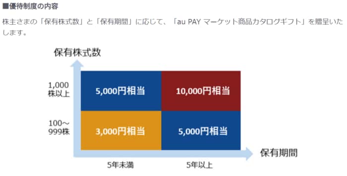 株主の「保有株式数」「保有期間」に応じて、「au PAY マーケット商品カタログギフト」を提供しています。