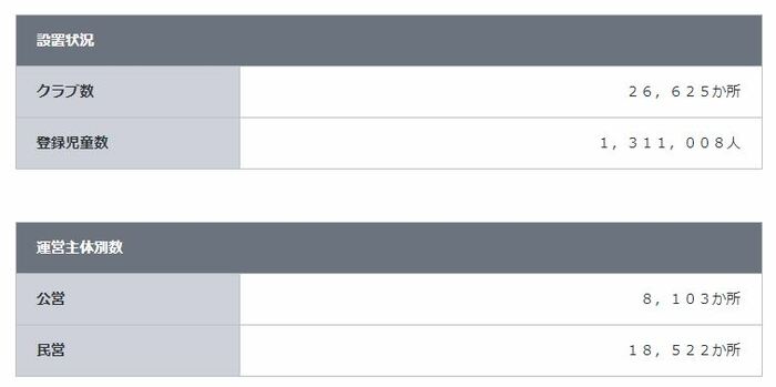 厚生労働省の「令和2年(2020年) 放課後児童健全育成事業(放課後児童クラブ)の実施状況」によると、2020年7月1日現在で2万6625か所あり、131万1008人の児童が利用しています。