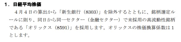 オリックスの流動性の高さなどがポイントとなって選ばれ、新生銀行と入れ替わる予定です。