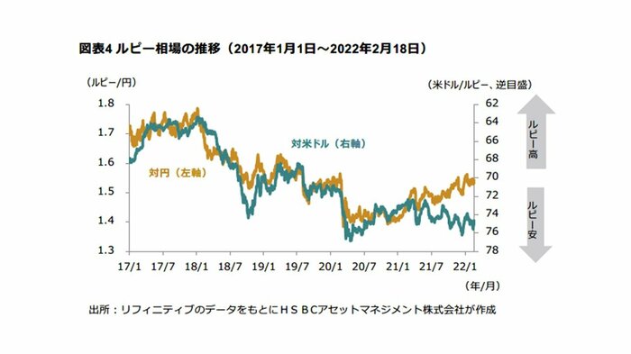 インドルピーは2021年9月以降は、米国の金融政策の正常化などから米ドル高・円安が進行するなかで、対米ドルでは下落、対円では上昇している(2月18日現在)。