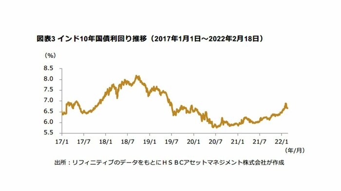 インド準備銀行(中央銀行)が政策金利を据え置くなど緩和的な金融環境は市場のサポート要因となっているものの、米国の長期金利の上昇や原油高などが債券市場の重しとなっている(2月18日現在)。