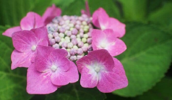 ガクアジサイはもともと日本に自生していたアジサイ。品種改良されて今にいたるアジサイの元祖といえます。中央に集まる花のまわりを額縁のようにガク片が囲んでいるのが名前の由来。控えめなたたずまいが魅力的なアジサイです。
