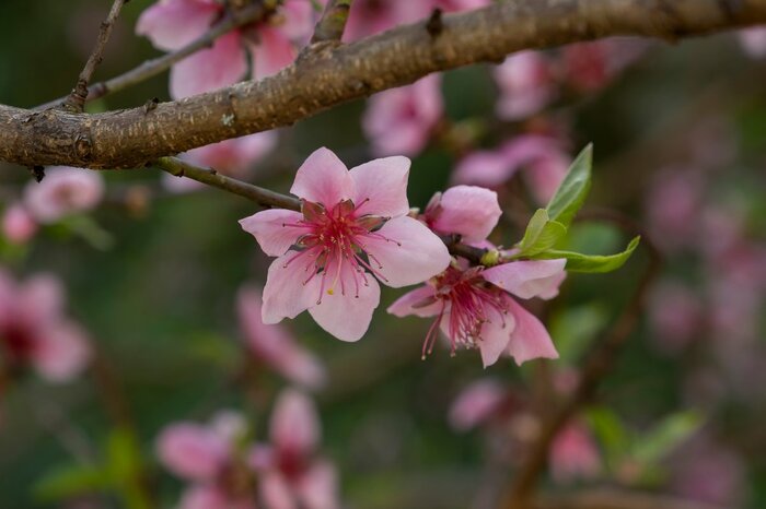 桃の花は、ひな祭りで飾る花としてもよく知られています。ハナモモは花を観賞するために改良されたモモなので、花つきがよいのが特徴です。原産地の中国では縁起のよい木として親しまれています。