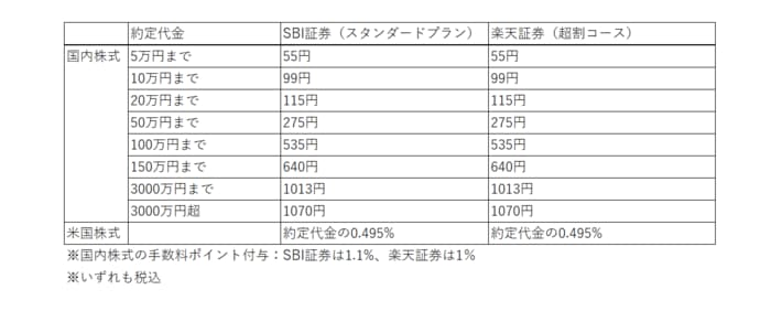 手数料は変わりませんが、国内株式の場合、SBI証券は手数料の月間合計金額1.1%相当のポイントが、楽天証券は外国株式の取引も含めて原則1%のポイントが付与されます。