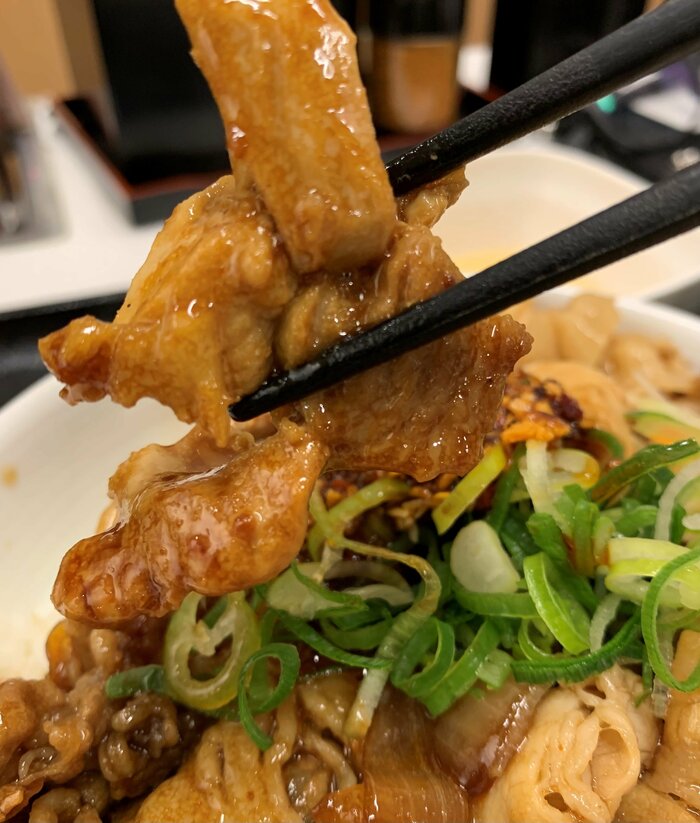 吉野家では、普段は目立たない存在の鶏肉ですが、ここではしっかりと自己主張をしています!味がぎゅっと染み込んでおり、プリプリ感も相まってとても美味です。ニンニクを効かせた特製たれが絶妙なアクセントとなり、ご飯が進みます。