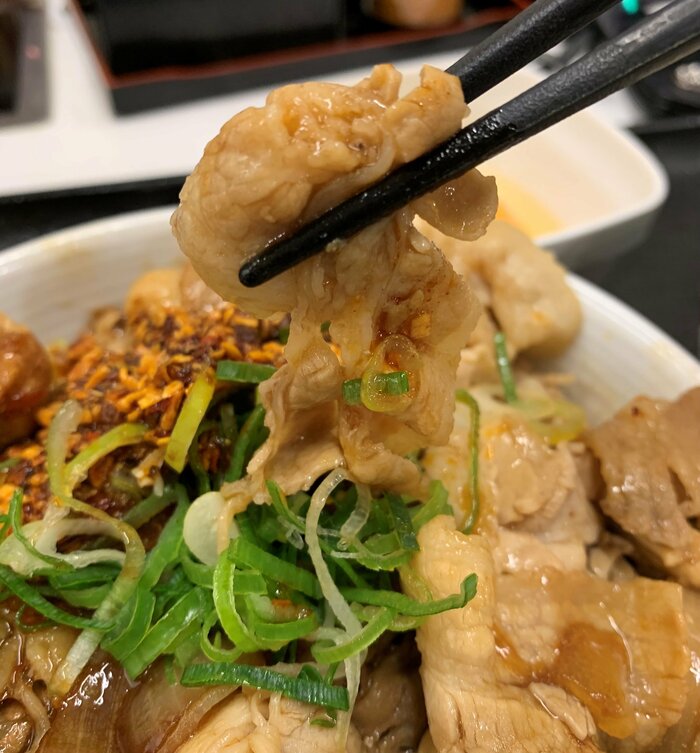 柔らかい豚肉は、細かく砕かれたフライドガーリック&ネギとの相性が絶妙。飽きない歯ごたえを楽しめます。