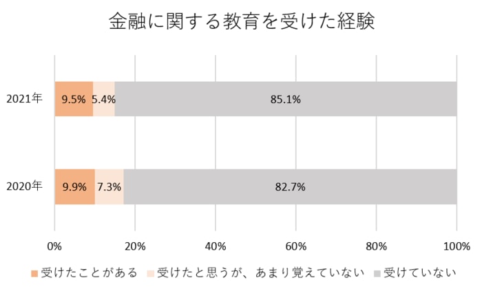 日本証券業協会が2021年10月20日に発表した日本全国の20歳以上の個人投資家5000人の証券投資に関する意識調査によると、「金融に関する教育を受けた経験がない人」は85.1%、「受けたと思うが、あまり覚えていない人」の5.4%を加えると90.5%にまでのぼることがわかりました。