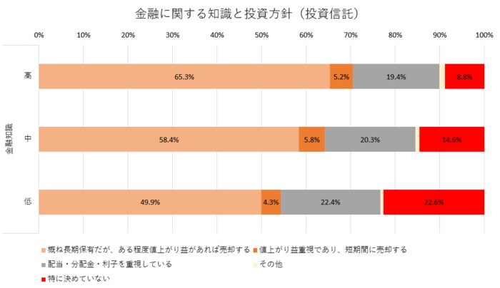 投資信託についても同様のことが言え、金融知識が高い人で長期保有をする人は65.3%、方針を決めていない人は8.8%であるのに対し、金融知識が低い人で長期保有をする人は49.9%、方針を決めていない人は22.6%となりました。