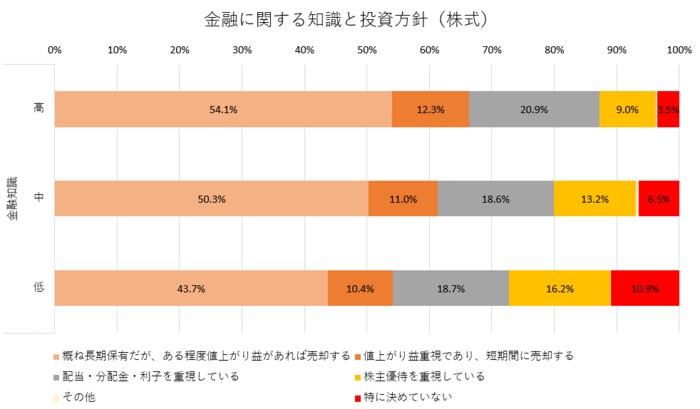 株式については、金融知識が高い人で長期保有をする人は54.1%、方針を決めていない人は3.5%であるのに対し、金融知識が低い人で長期保有をする人は43.7%、方針を決めていない人は10.9%となりました。