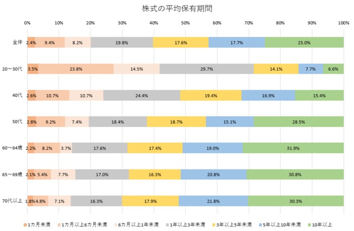 株式の平均保有期間について、「1年未満」の層は20~30代で71.5%にのぼり、他の年代と比較して圧倒的に高いです。