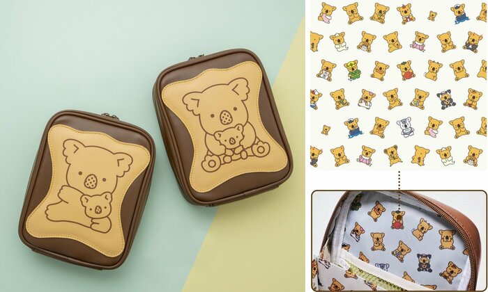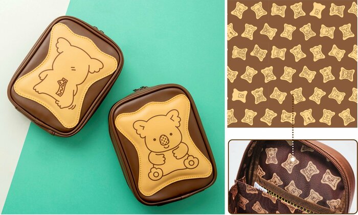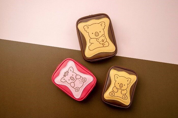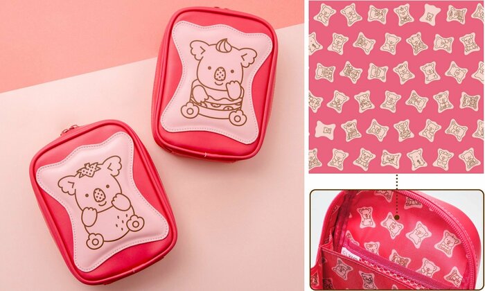 ポーチはチョコレート・いちご・BIGサイズのチョコレートの3種類。両面にはそれぞれ違う絵柄のぷっくりかわいいビスケットデザイン描かれ、内側にはビスケットの総柄がデザインされるなど、かわいさも満点。