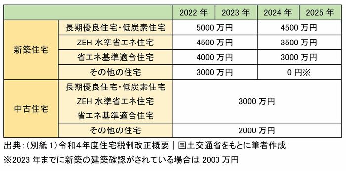 新築の長期優良住宅・低炭素住宅を2022年中に取得した場合、借入限度額は5000万円となり、控除額は最大で455万円(1年間35万円)になります。新築でも一般の住宅(その他の住宅)になると、控除額は最大で273万円と下がり、2024年以降に入居すると0円(2023年までに建築確認で2000万円)になってしまいます。