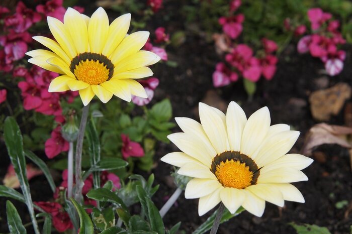 光沢があり鮮やかな花色が特徴のガザニア。光が当たると花が開き、中央が濃くコントラストのある色合いがキレイです。高温乾燥に強く、春から秋まで咲き続けます。