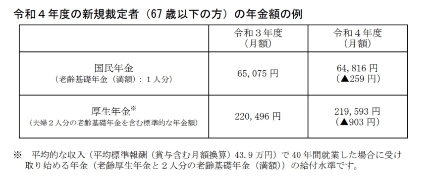 厚生年金はモデル夫婦(夫婦2人分の国民年金を含む標準的な年金額)で「月額22万496円(▲903円)」です。