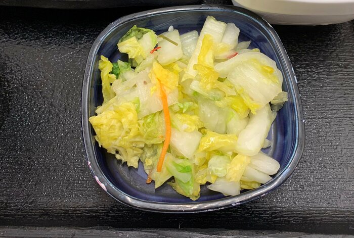 吉野家のお新香は爽やかな酸味があり、甘めの牛肉と合わせると味のメリハリがつきます。かつ、白いご飯との相性も最高!
