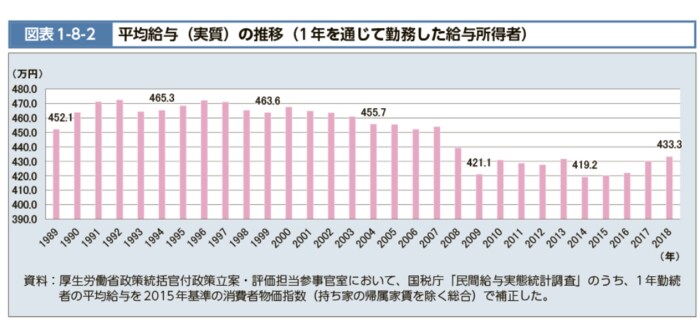 専業主婦になるか決める際、その判断基準の一つとしていわれるのが夫の年収です。厚生労働省の「令和2年版 厚生労働白書」の資料より、平均給与の推移を1989~2018年までみていきましょう。