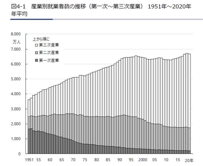 独立行政法人 労働政策研究・研修機構の「図4 産業別就業者数(第一次~第三次産業、主要産業大分類)」より、第一次~第三次産業の推移を1951~2020年まで確認しましょう。