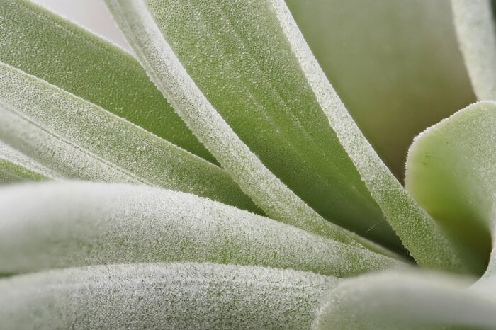 葉の表面には白く細かな繊毛が付いています。この繊毛をトリコームといい、空気中の水分を吸収する役割を果たします。繊毛が多い種は全体が銀色に見え、スタイリッシュな雰囲気です。