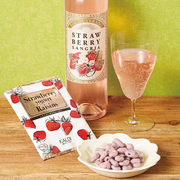 また、セットのお酒はストロベリー香るロゼワインベースの甘酸っぱい「ストロベリー・サングリア・フィズ」。さらにレーズンをいちご風味のチョコレートでコーティングした「いちごヨーグルトレーズン」と、デスク周りや旅行などにも大活躍な「バッグ in バッグ」の4点セットです。