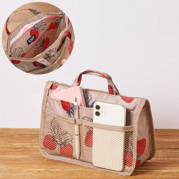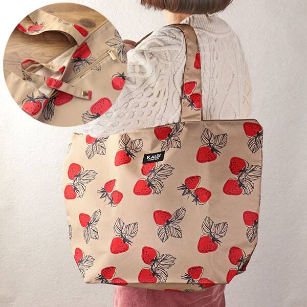 毎年、好評のあまりあっという間に売切れてしまう「いちごバッグ」セット。今年は、いちご柄エコバッグとおそろいのいちご柄バッグinバッグが登場しました。大人っぽい落ち着きのあるベージュ色にいちご柄がかわいいデザインのエコバッグは、便利なバッグ口部と外側にジッパーが付いています。