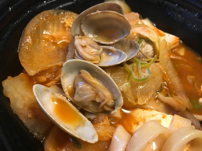 ピリ辛のチゲと、あさりのお出汁が絶妙なあんばいで、腹ぺこ胃袋にしみわたります。辛い・熱い・うまい!やみつきになりそうな、クセになる辛さです。