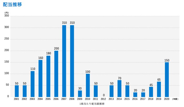 商船三井の2021年3月期の期末配当は135円、2022年3月期の中間配当は300円でした。