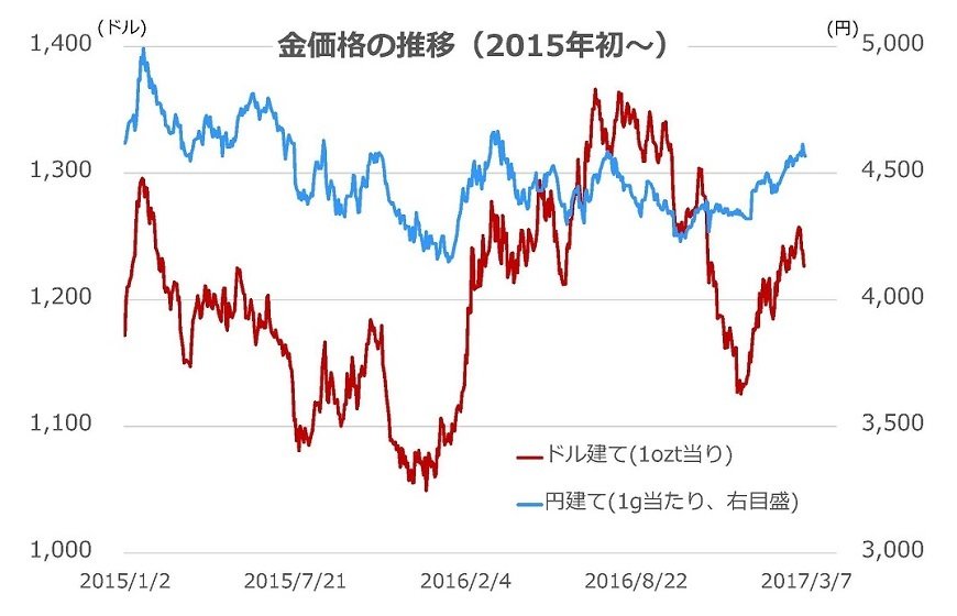 しかし、現時点では、2017年3月の利上げ実施の可能性が高まった結果、3月に入ってから足元の金価格は弱含んで推移しています。