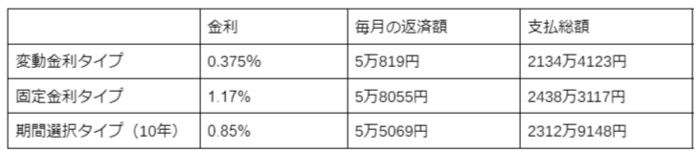 金利がもっとも低い変動金利タイプと高い固定金利タイプでは、毎月の返済額におよそ7200円の差があります。現実には考えにくいのですが、仮にその差額が35年続けば、支払総額でおよそ300万円も固定期間タイプの方が多く支払うことになります。