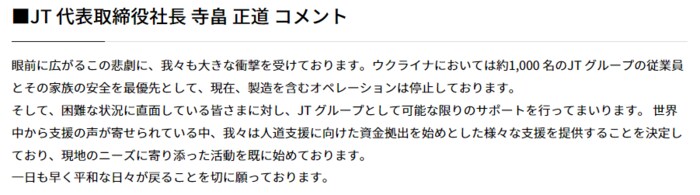 ウクライナにおいては約1000名のJTグループの従業員とその家族の安全を最優先として、現在、製造を含むオペレーションは停止しております。