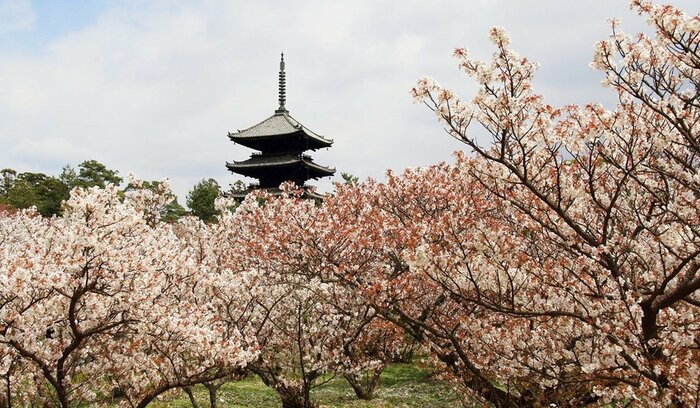京都市右京区にある仁和寺は御室桜(オムロザクラ)で有名です。ソメイヨシノが咲き終わった頃、やや遅めに咲く御室桜。樹高が2メートルと低めなので、目の前にサクラが咲き広がる景色を楽しめます。