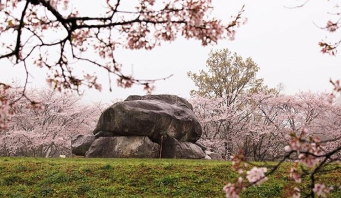 石舞台古墳は奈良県高市郡明日香村にある日本最大級の古墳です。古墳を囲むようにサクラが植えられ、古代の歴史を感じさせる石舞台と華やかなサクラのコラボレーションが圧巻。ライトアップされるとより神秘的な美しさがあります。