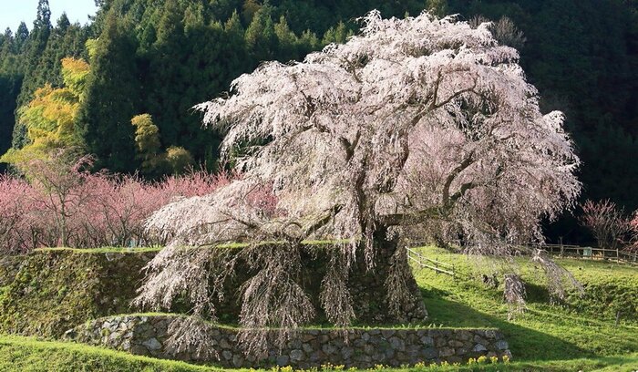 奈良県宇陀市の樹齢300年ともいわれる又兵衛桜。大阪の陣で戦った戦国武将の後藤又兵衛桜の屋敷跡にあり、地元住民から親しまれているしだれ桜です。ハナモモや菜の花も咲き、毎年多くのカメラマンが訪れる撮影スポット。