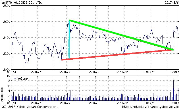 ご覧のように、株価は最近の報道を受けて緑線を上回ってきました。チャート分析的には、三角保ち合いを上放れた場合の上昇幅は水色の縦線の長さになると言われ、その長さは約500円になります。