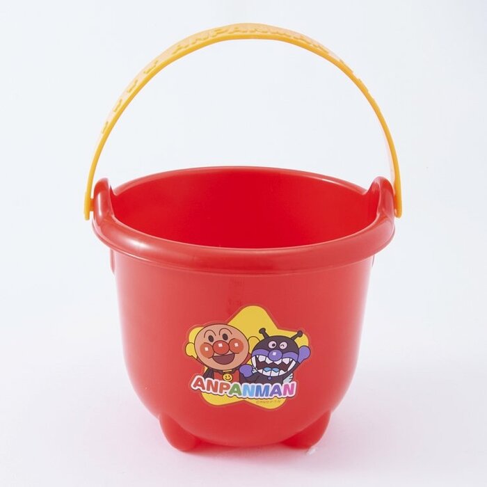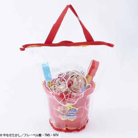 持ち運びがしやすい、収納袋付きのアンパンマンの砂場セットです。収納袋に名前欄が付いていて便利です。また、バケツの底面ではアンパンマンのスタンプ遊びができたり、スコップとクマデのクリップはやわらかくにぎりやすい素材になるなど工夫されています。