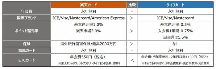 楽天カード・ライフカード「早見表で基本のスペック比較」