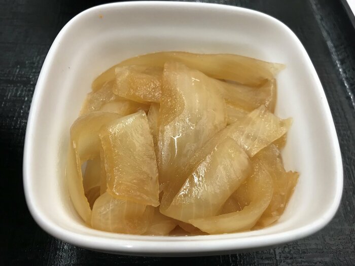 吉野家ホームページのメニューでは、上に玉ねぎがてんこ盛りに乗っている写真で紹介されていますね。実際の店舗では、このように「ねぎだく」が小皿に別添えで提供されます。