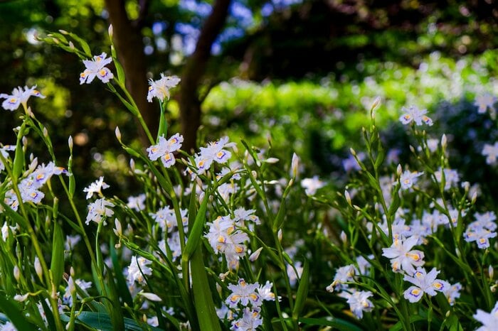 4~5月にかけてアヤメのような花を咲かせるシャガは、洋風の庭だけでなく、和風の庭にもオススメの花。細くて長い葉を扇のように広げ、1株に20輪以上のたくさんの花を咲かせます。