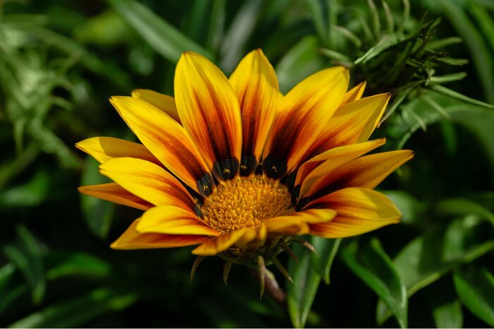花びらに光沢があり、太陽の光に反射してキラキラと輝く花、ガザニア。赤やピンク系、褐色系、オレンジ系のグラデーションがキレイな品種など、鮮やかな花色で春から秋にかけて花壇を彩ります。