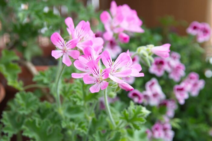 品種の多いハーブゼラニウムは多年草の植物。通常のゼラニウムと比べる葉が小さく、ローズゼラニウムやアップルゼラニウム、パインゼラニウムなどの品種があります。