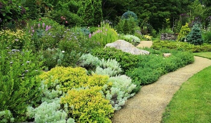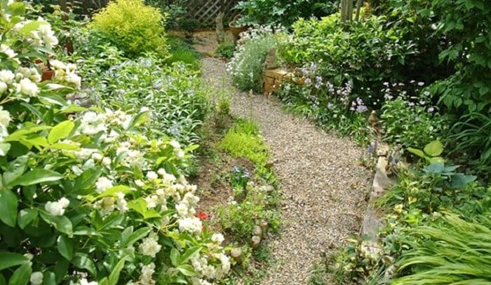 小石やレンガ、枕木で小径を作って、花壇の間を散策できるようにするのもオシャレ。カーブを描いた小径にすると、狭い庭に奥行きを感じられるでしょう。この先にどんな花が咲いているのか…という期待感も演出できます。