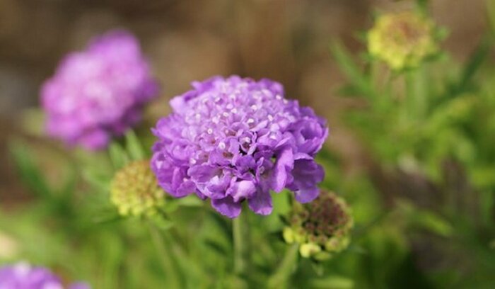 マツムシソウという和名を持つスカビオサ。背丈は10~30センチほどで、春と秋に開花します。細い枝先に丸い花を咲かせ、風が吹くとしなやかに揺れる様子がステキです。